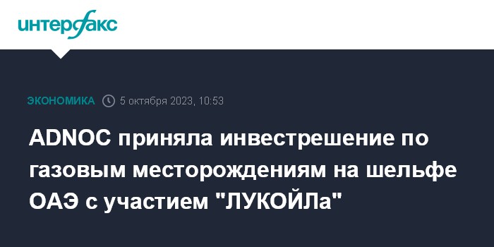 Москва. 5 октября. INTERFAX.RU - ADNOC приняла окончательное инвестиционное решение (FID) по проекту освоения двух газовых месторождений на шельфе ОАЭ - Hail и Ghasha.