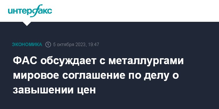 Москва. 5 октября. INTERFAX.RU - Федеральная антимонопольная служба (ФАС) РФ продолжает обсуждать с металлургическими компаниями возможность заключения мирового соглашения, однако не видит оснований для минимального штрафа по "делу металлургов" (о необоснованном завышении цен на метпродукцию в 2021 году) из-за их хороших финансовых результатов по итогам 2022 года.