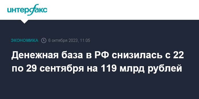 На 22 сентября денежная база в России равнялась 18 669,4 млрд рублей. Таким образом, за период она снизилась на 0,64%, или на 119 млрд рублей.