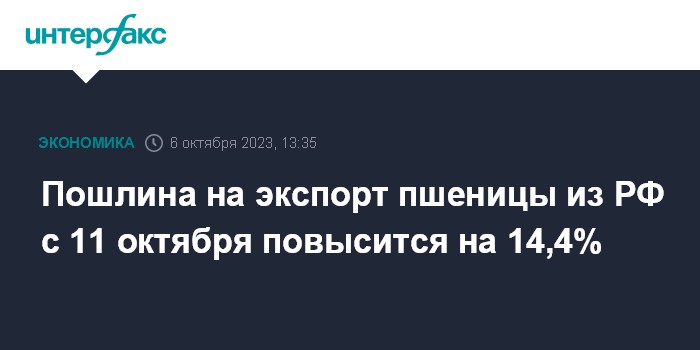 Москва. 6 октября. INTERFAX.RU - Ставка пошлины на экспорт пшеницы из РФ с 11 октября составит 5 224 рубля за тонну против 4 564,6 рубля неделей ранее, сообщает Минсельхоз.