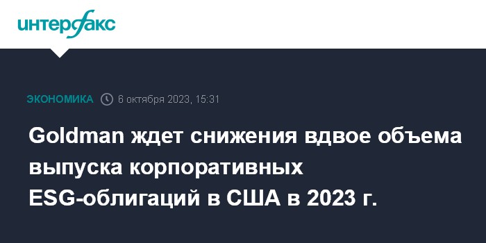 Москва. 6 октября. INTERFAX.RU - Совокупный объем выпуска ESG-облигаций американскими компаниями в 2023 году будет вдвое ниже, чем в прошлом, прогнозируют эксперты Goldman Sachs Group Inc.
