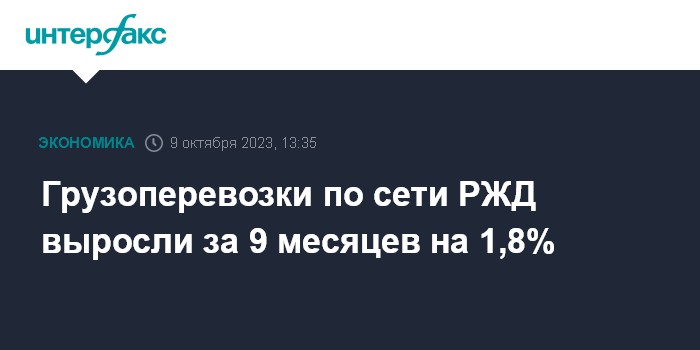 Москва. 9 октября. INTERFAX.RU - Объем перевозок грузов по сети ОАО "Российские железные дороги" вырос в январе-сентябре 2023 года на 1,8% в годовом исчислении, до 1,03 млрд тонн, сообщается в материалах компании, с которыми ознакомился "Интерфакс".