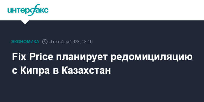 Москва. 9 октября. INTERFAX.RU - Ритейлер Fix Price может сменить юрисдикцию с Кипра на Казахстан, говорится в сообщении ритейлера.