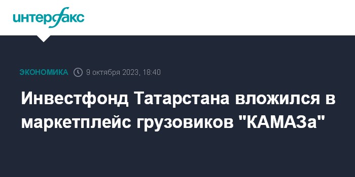 Москва. 9 октября. INTERFAX.RU - Инвестиционно-венчурный фонд Татарстана стал владельцем 10% в уставном капитале ООО "Тракинсток" – маркетплейса "КАМАЗа" по продаже грузовой автотехники, говорится в материалах ЕГРЮЛ.