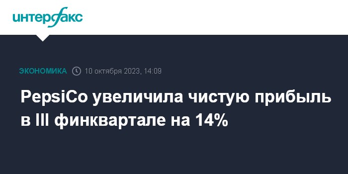 Москва. 10 октября. INTERFAX.RU - Американская PepsiCo Inc., один из крупнейших в мире производителей безалкогольных напитков, увеличила чистую прибыль в третьем квартале 2023 финансового года на 14%, выручку - на 7%.