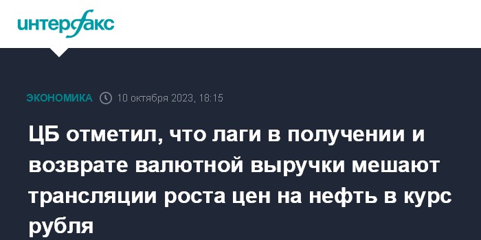 Москва. 10 октября. INTERFAX.RU - Лаги в получении и возврате валютной выручки экспортеров мешают трансляции роста цен на нефть в курс рубля, отмечает в своем докладе ЦБ РФ.