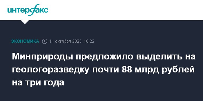 Москва. 11 октября. INTERFAX.RU - Минприроды предлагает в бюджете на 2024-2026 годы заложить на вопросы геологоразведки около 88 млрд рублей, сообщил глава ведомства Александр Козлов на заседании комитета Госдумы по экологии, природным ресурсам и охране окружающей среды.