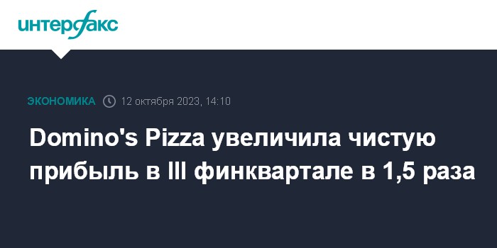 Москва. 12 октября. INTERFAX.RU - Американская сеть пиццерий Domino's Pizza Inc. в третьем квартале 2023 финансового года увеличила чистую прибыль в полтора раза, однако показатель выручки снизился и оказался хуже ожиданий аналитиков.