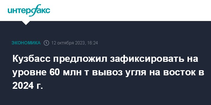 Москва. 12 октября. INTERFAX.RU - Кузбасс предлагает правительству РФ зафиксировать на уровне 60 млн тонн объем вывоза угля из региона на экспорт в восточном направлении по желдороге в 2024 году, сообщила пресс-служба регионального правительства.