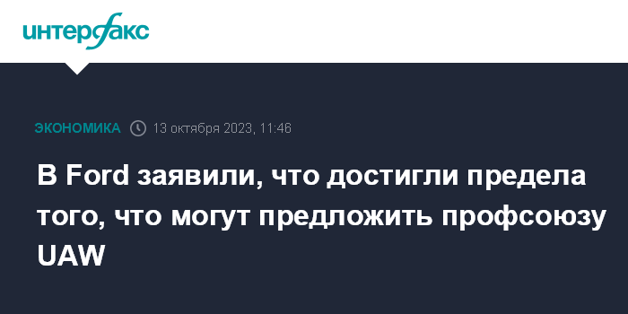 Москва. 13 октября. INTERFAX.RU - Автопроизводитель Ford Motor Co. достиг предела того, что он может предложить профсоюзу работников автомобильной отрасли United Auto Workers (UAW), заявил глава подразделения Ford Blue (сегмент автомобилей с двигателями внутреннего сгорания) Кумар Галхотра.