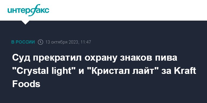 Москва. 13 октября. INTERFAX.RU - Суд по интеллектуальным правам 11 октября удовлетворил заявление ФКП "Союзплодоимпорт" о досрочном прекращении охраны товарных знаков "Crystal light" (№84899) и "Кристал лайт" (№84900) за американской Kraft Foods Group Brands LLC в отношении товара 32-го (пиво) класса МКТУ вследствие неиспользования.