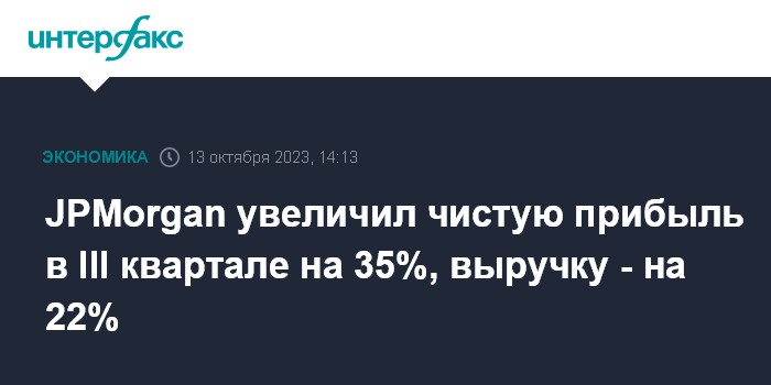 Москва. 13 октября. INTERFAX.RU - JPMorgan Chase & Co., крупнейший банк США по объему активов, увеличил чистую прибыль в третьем квартале 2023 года на 35%, выручку - на 22%.
