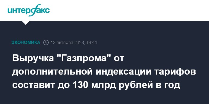 Москва. 13 октября. INTERFAX.RU - Выручка Газпрома от дополнительной индексации тарифов на газ в 2024-2026 годах. составит порядка 120-130 млрд рублей в год, при этом в бюджет через запланированный механизм корректировки НДПИ будет изъято более 90% этих средств, заявил замминистра финансов Алексей Сазанов в думском комитете по бюджету .