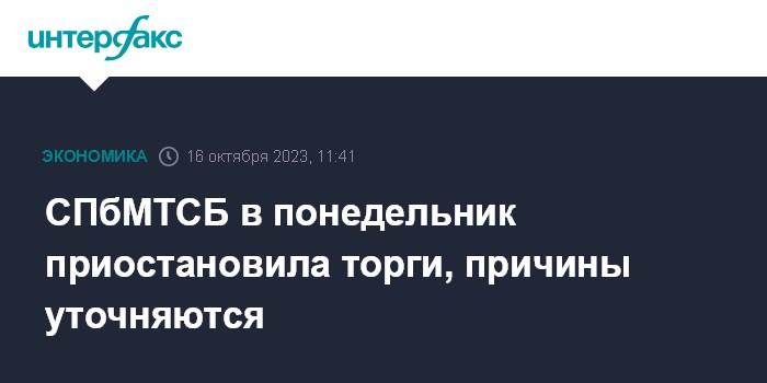 "В 11:25 мск торги в товарных секциях АО "СПбМТСБ" будут приостановлены. Причины уточняются. О времени возобновления торгов будет сообщено дополнительно. Приносим извинения за причинённые неудобства", - говорится в сообщении биржи.
