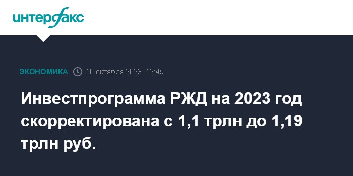 Москва. 16 октября. INTERFAX.RU - Инвестпрограмма ОАО "РЖД" на 2023 год скорректирована с 1,1 трлн до 1,19 трлн рублей.