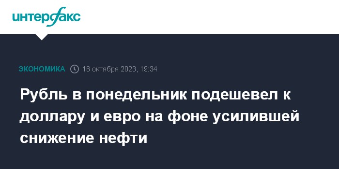 Как отмечают эксперты "Интерфакс-ЦЭА", рубль подешевел к доллару и евро по итогам торгов понедельника на фоне ускорившей снижение нефти. Поддержку рублю продолжает оказывать решение об обязательной продаже валютной выручки с целью стабилизировать курс рубля, о введении которой было объявлено на прошлой неделе. Участники торгов продолжают внимательно следить за новостями на эту тему и другими официальными заявлениями властей РФ.