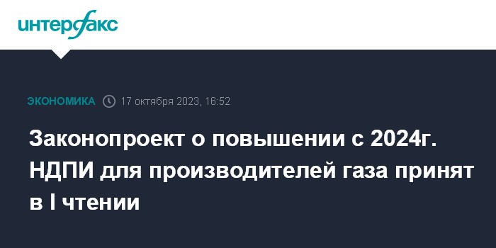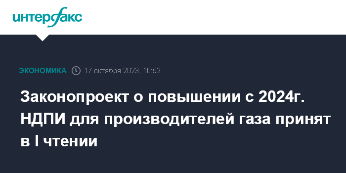 Москва. 17 октября. INTERFAX.RU - Госдума приняла в первом чтении законопроект, который увеличивает с 1 января 2024 г. ставку НДПИ при добыче газа путем увеличения показателя Ккг, применяемого в расчете ставки налога. Повышение НДПИ - часть маневра по изъятию дополнительных доходов производителей газа в бюджет, которые у них возникнут из-за опережающей индексации оптовых цен на газ для промышленности и населения.