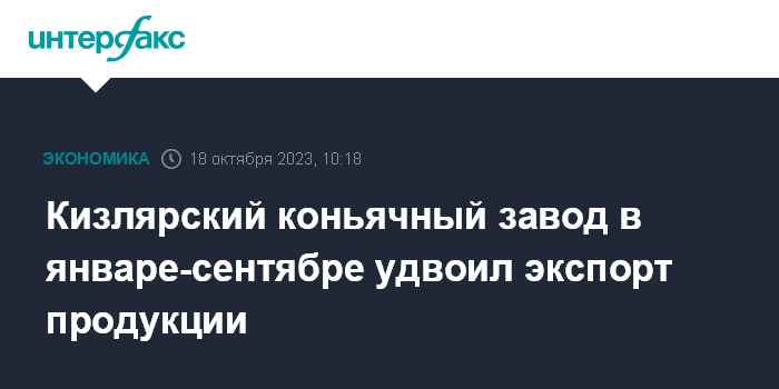 Москва. 18 октября. INTERFAX.RU - АО "Кизлярский коньячный завод" (ККЗ) в январе-сентябре 2023 года экспортировало 9,5 тыс. декалитров (дал) готовой продукции, сообщил "Интерфаксу" генеральный директор предприятия Евгений Дружинин.