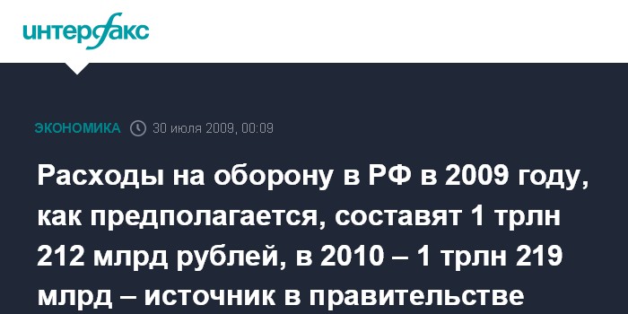 Расходы на оборону в РФ в 2009 году, как предполагается, составят 1 трлн 212 млрд рублей, в 2010 – 1 трлн 219 млрд – источник в правительстве