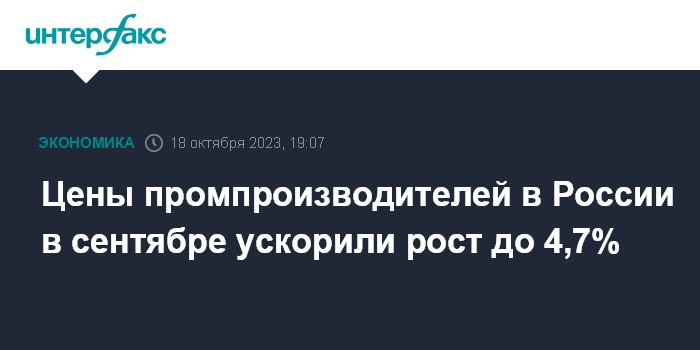 Москва. 18 октября. INTERFAX.RU - В сентябре 2023 года цены производителей промышленных товаров выросли на 4,7% после роста на 4,4% в августе, на 1,4% в июле, нулевого роста в июне, роста на 3,7% в мае, на 2,4% в апреле, на 2,6% в марте и на 0,9% в феврале, сообщил в среду Росстат.