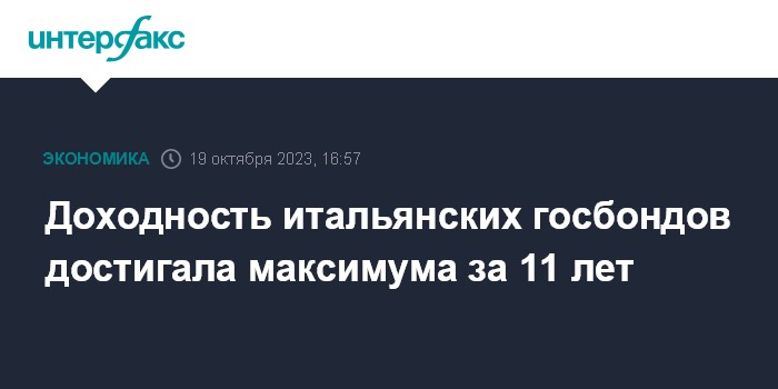 Москва. 19 октября. INTERFAX.RU - Доходность государственных облигаций Италии обновила максимум за 11 лет в ходе торгов в четверг, пишет Financial Times.