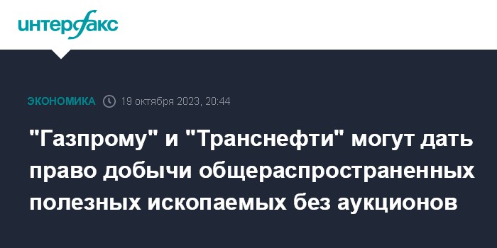 Москва. 19 октября. INTERFAX.RU - Правительство РФ прорабатывает вопрос безаукционного предоставления лицензий на участки общераспространенных полезных ископаемых "Газпрому" и "Транснефти", сообщил на совещании в Совете Федерации и.о. замглавы департамента госполитики и регулирования в области геологии и недропользования Минприроды Максим Киржиманов.