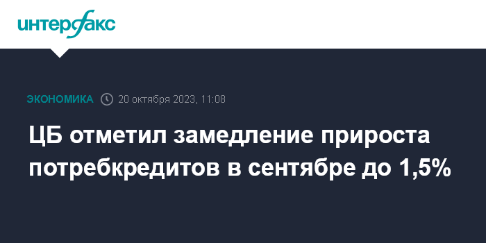 Москва. 20 октября. INTERFAX.RU - Рост потребительского кредитования в сентябре замедлился до 1,5% с 2,4% в августе, говорится в обзоре Банка России, посвященном динамике развития банковского сектора.