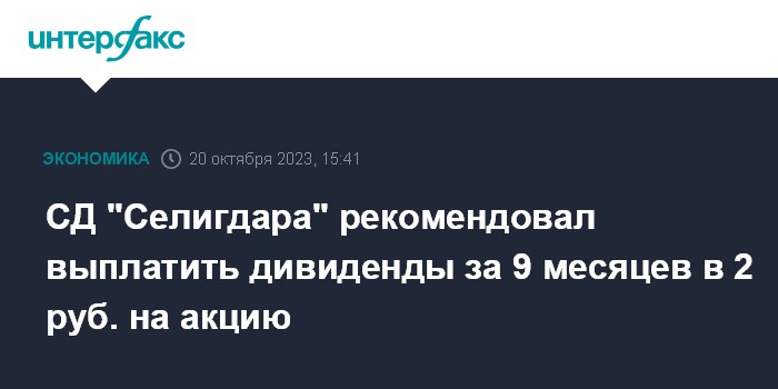 Москва. 20 октября. INTERFAX.RU - Совет директоров холдинга "Селигдар" рекомендовал акционерам выплатить дивиденды по результатам девяти месяцев 2023 года в размере 2 рубля на акцию, сообщила компания.