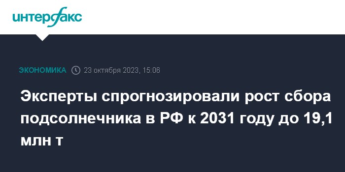 Москва. 23 октября. INTERFAX.RU - РФ к 2031 году может довести сбор подсолнечника до 19,1 млн тонн с 16,4 млн тонн в 2022 году. Доля отечественных семян на рынке при этом увеличится до 80% с 22% соответственно. Такой прогноз содержится в исследовании, проведенном специалистами аналитического центра компании "Русид". Центр был создан для изучения тенденций развития мирового и отечественного агросектора.