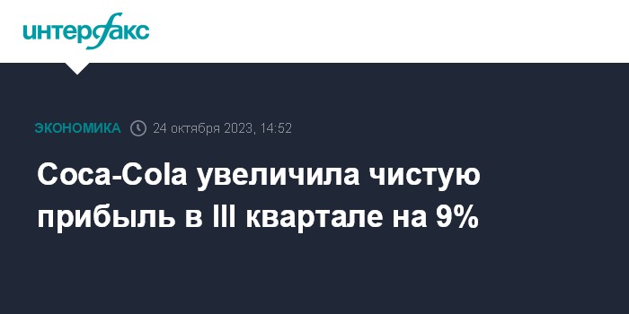 Москва. 24 октября. INTERFAX.RU - Американская Coca-Cola Co., крупнейший в мире производитель безалкогольных напитков, увеличила чистую прибыль в третьем квартале 2023 года на 9%, выручку - на 8%.