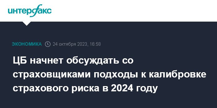 Москва. 24 октября. INTERFAX.RU - Банк России рассчитывает начать обсуждение со страховщиками подходов к калибровке страхового риска в 2024 году и намерен при этом использовать комплексный подход, сообщил на страховом форуме директор департамента страхового рынка ЦБ Илья Смирнов.