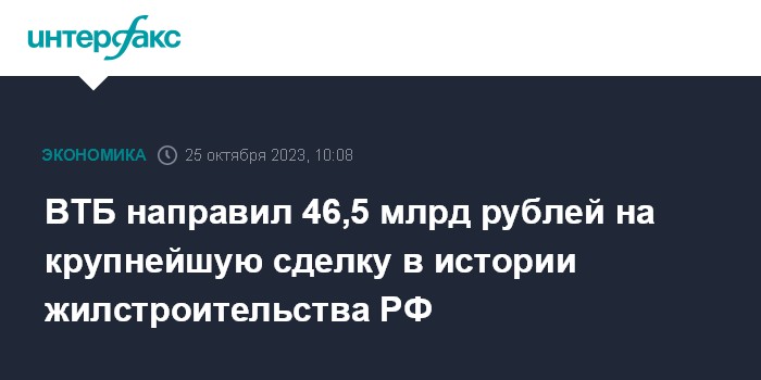 ВТБ направил 46,5 млрд рублей на крупнейшую сделку в истории жилстроительства РФ