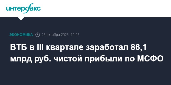 Москва. 26 октября. INTERFAX.RU - ВТБ в третьем квартале заработал 86,1 млрд рублей чистой прибыли по МСФО, что в 1,7 раза ниже результата предыдущего квартала, свидетельствует отчетность кредитной организации.