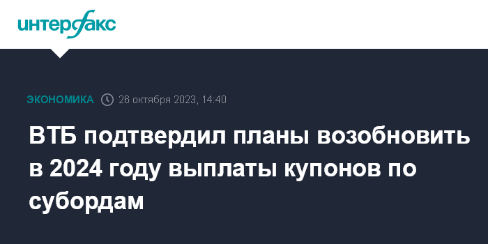 Москва. 26 октября. INTERFAX.RU - ВТБ подтвердил планы возобновить выплату купонов по своим субординированным облигациям в 2024 году.