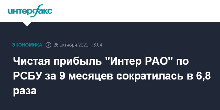 Москва. 26 октября. INTERFAX.RU - Чистая прибыль ПАО "Интер РАО" по РСБУ за девять месяцев 2023 года снизилась в 6,8 раза по сравнению с аналогичным периодом прошлого года, до 4,86 млрд руб., говорится в отчете компании.