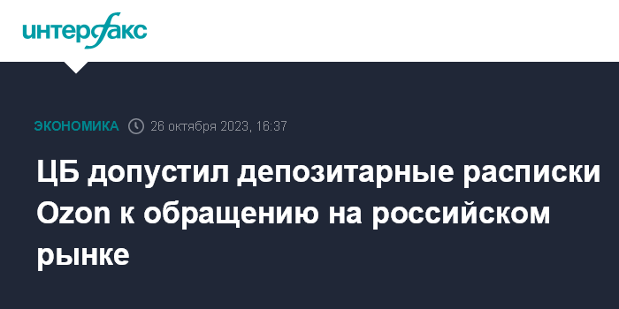 Москва. 26 октября. INTERFAX.RU - Банк России в четверг зарегистрировал проспект депозитарных расписок на акции Ozon Holdings PLC и принял решение допустить их к публичному обращению в РФ, говорится в сообщении финансового регулятора.