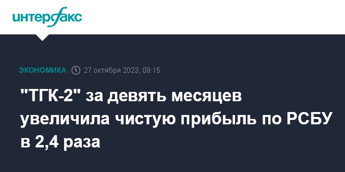 Москва. 27 октября. INTERFAX.RU - ПАО "ТГК-2" в январе-сентябре 2023 года получило 1 млрд 116,7 млн рублей чистой прибыли по РСБУ, что в 2,4 раза больше, чем за аналогичный период прошлого года, говорится в отчете компании.