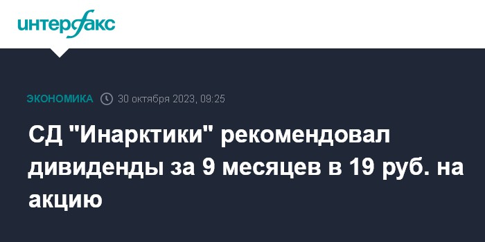 СД "Инарктики" рекомендовал дивиденды за 9 месяцев в 19 руб. на акцию
