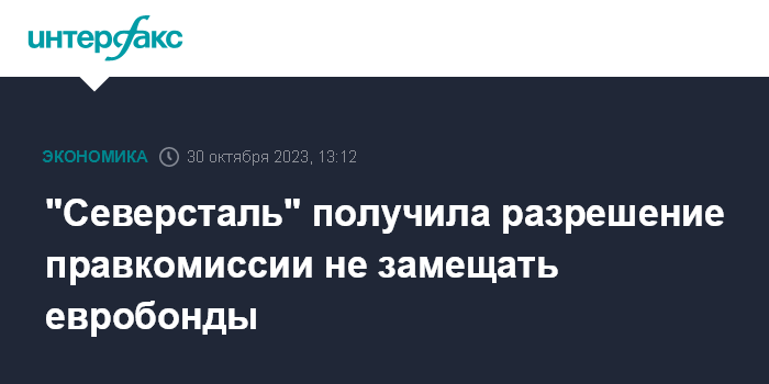 Москва. 30 октября. INTERFAX.RU - Правительственная комиссия по контролю за осуществлением иностранных инвестиций разрешила "Северстали" не выпускать замещающие облигации взамен находящихся в обращении евробондов.