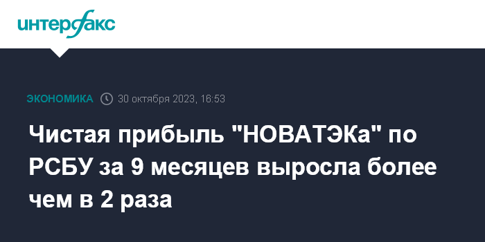 Москва. 30 октября. INTERFAX.RU - Чистая прибыль "НОВАТЭКа" по РСБУ за 9 месяцев 2023 года составила 404,391 млрд рублей. Это более чем в 2 раза больше по сравнению с аналогичным периодом 2022 года (185,587 млрд рублей), говорится в отчете компании.