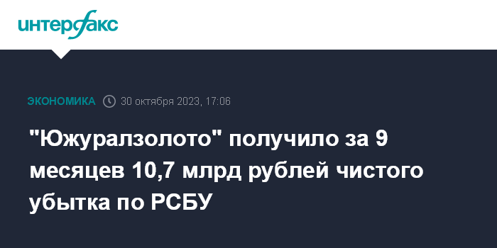 Москва. 30 октября. INTERFAX.RU - АО "Южуралзолото группа компаний" (ЮГК) за 9 месяцев 2023 года получило чистый убыток по РСБУ в размере 10,7 млрд рублей, говорится в его отчетности. По сравнению с аналогичным периодом прошлого года убыток вырос на 28%.