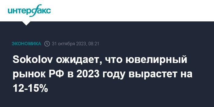 Москва. 31 октября. INTERFAX.RU - Рынок ювелирной розницы в России в 2023 году вырастет на 12-15%, ожидает аналитический центр ювелирного ритейлера Sokolov.