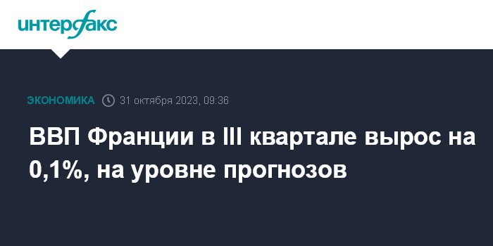 Москва. 31 октября. INTERFAX.RU - Объем ВВП Франции в третьем квартале увеличился на 0,1% по сравнению с предыдущими тремя месяцами, говорится в предварительных данных национального статистического института Insee.