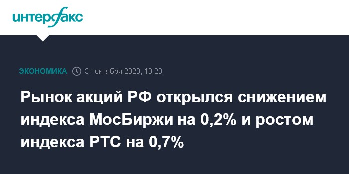 Рынок акций РФ открылся снижением индекса МосБиржи на 0,2% и ростом индекса РТС на 0,7%
