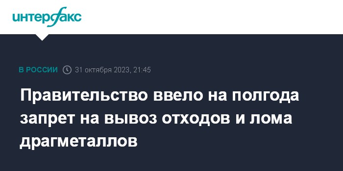 Москва. 31 октября. INTERFAX.RU - Правительство ввело временный запрет на вывоз из России отходов и лома драгоценных металлов. Он будет действовать с 1 ноября 2023 года по 30 апреля 2024 года включительно, сообщает сайт правительства.