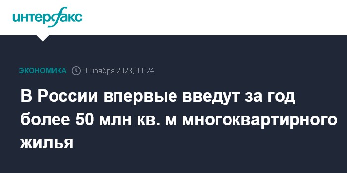 Москва. 1 ноября. INTERFAX.RU - В России объем ввода многоквартирных домов (МКД) по итогам года впервые превысит 50 млн "квадратов", заявил замглавы Минстроя Никита Стасишин и добавил, что такого не было еще никогда.