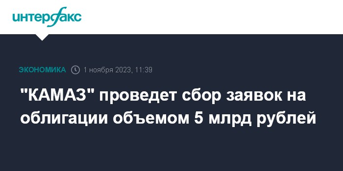 Москва. 1 ноября. INTERFAX.RU - ПАО "КАМАЗ" в первой половине ноября планирует провести сбор заявок инвесторов на приобретение 2-летних облигаций серии БО-П11 объемом 5 млрд рублей, сообщил "Интерфаксу" источник на финансовом рынке.