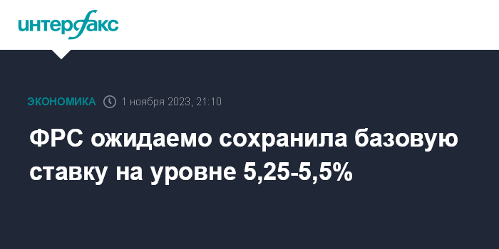 Москва. 1 ноября. INTERFAX.RU - Федеральная резервная система (ФРС) сохранила процентную ставку по федеральным кредитным средствам (federal funds rate) на уровне 5,25-5,5% годовых, говорится в сообщении Федерального комитета по операциям на открытом рынке (FOMC) по итогам завершившегося в среду заседания.