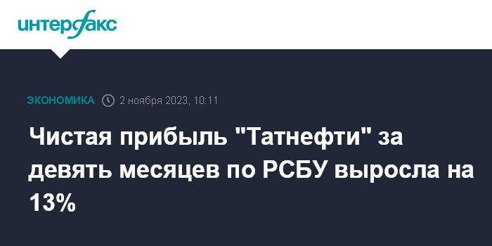 Москва. 2 ноября. INTERFAX.RU - Чистая прибыль "Татнефти" за девять месяцев 2023 года по РСБУ выросла на 13% относительно аналогичного периода прошлого года, до 208,395 млрд рублей, следует из отчета компании.