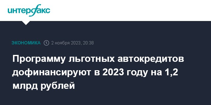 Москва. 2 ноября. INTERFAX.RU - Программа льготного автокредитования будет дофинансирована в 2023 году на 1,2 млрд рублей, сообщил вице-премьер - глава Минпромторга Денис Мантуров через пресс-службу министерства.
